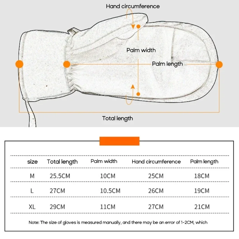 XL Total Length: 29cm/11.42'' Width: 11cm/4.33'' Hand Circumference: 27cm/10.63'' Palm-Length: 21cm/8.27''